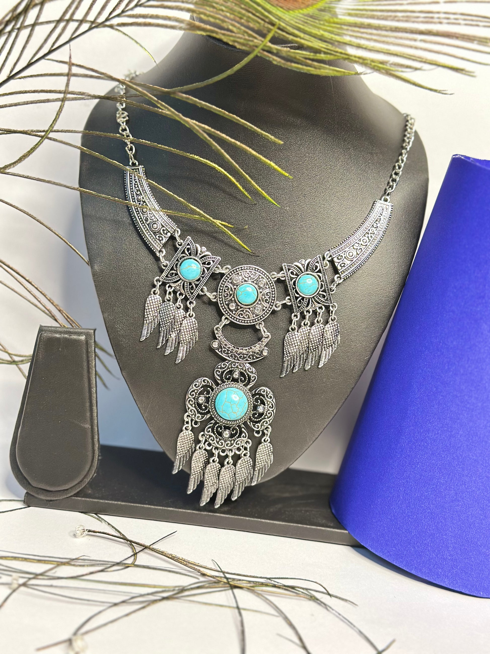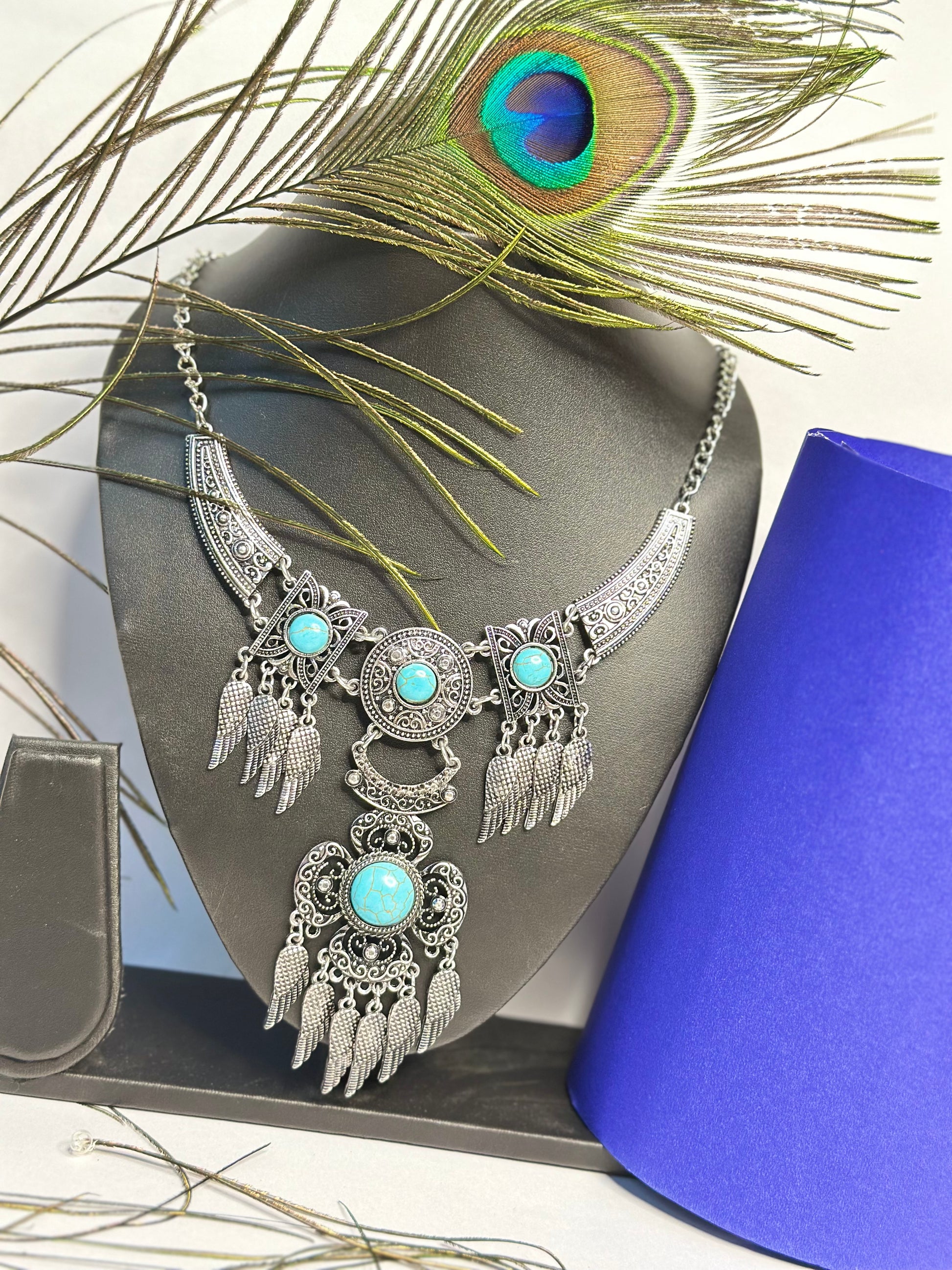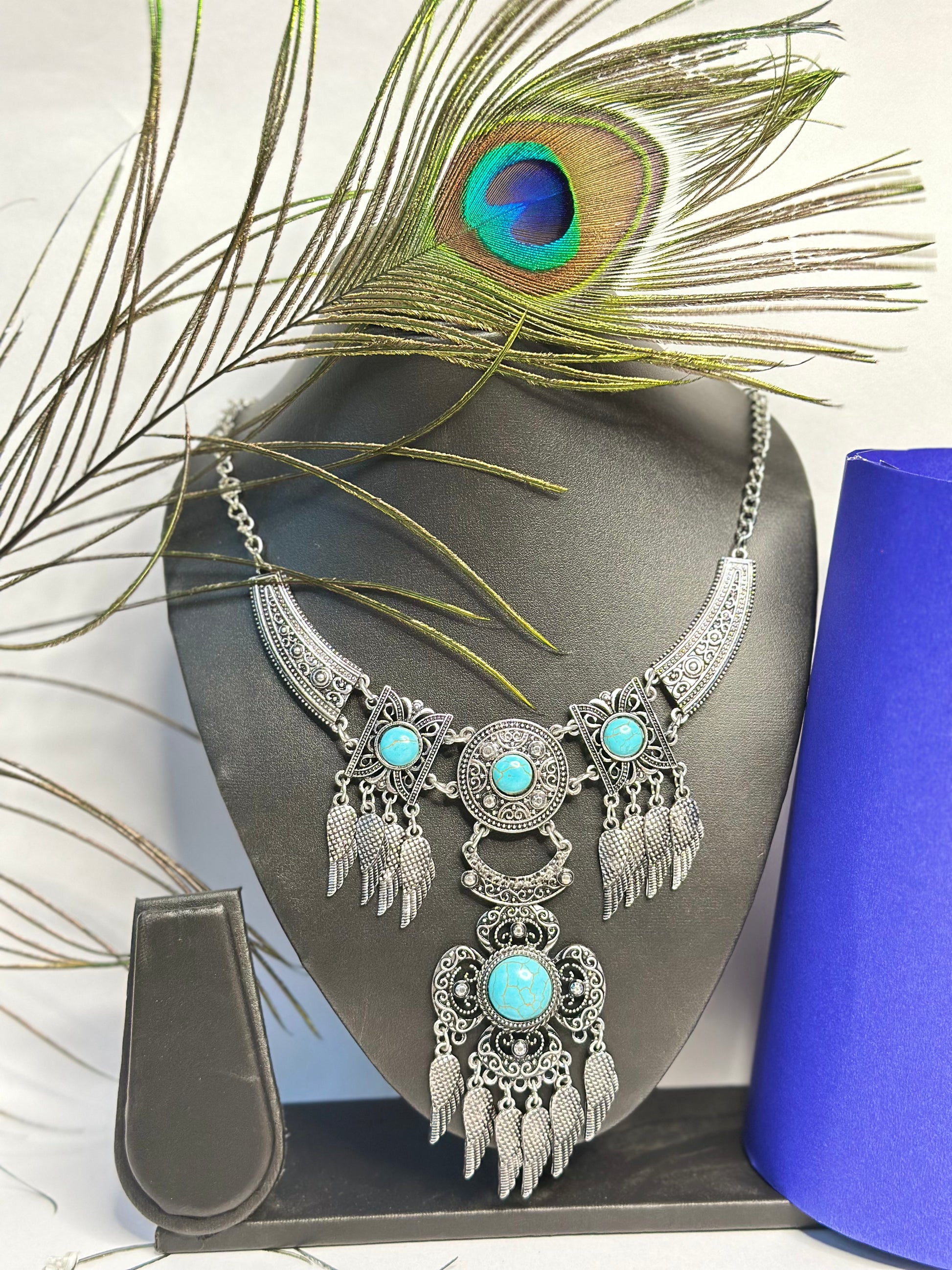 Elevate your ethnic and boho-chic style with this oxidised silver statement necklace. Adorned with vibrant turquoise stones and intricate wing-shaped danglers, this necklace is a perfect blend of tradition and trend. Whether paired with sarees, kurtis, or western outfits, it adds a bold and elegant touch to your look.