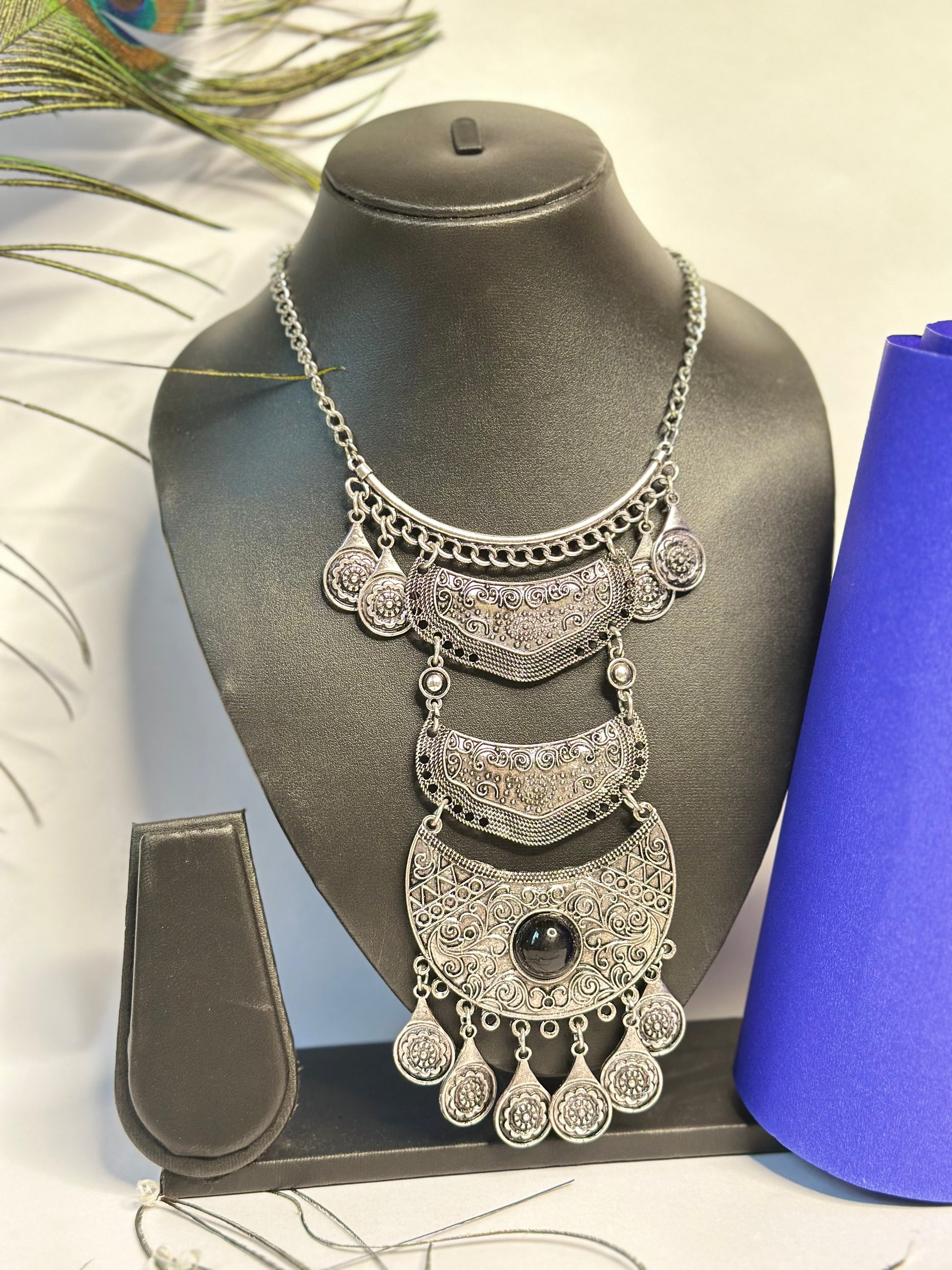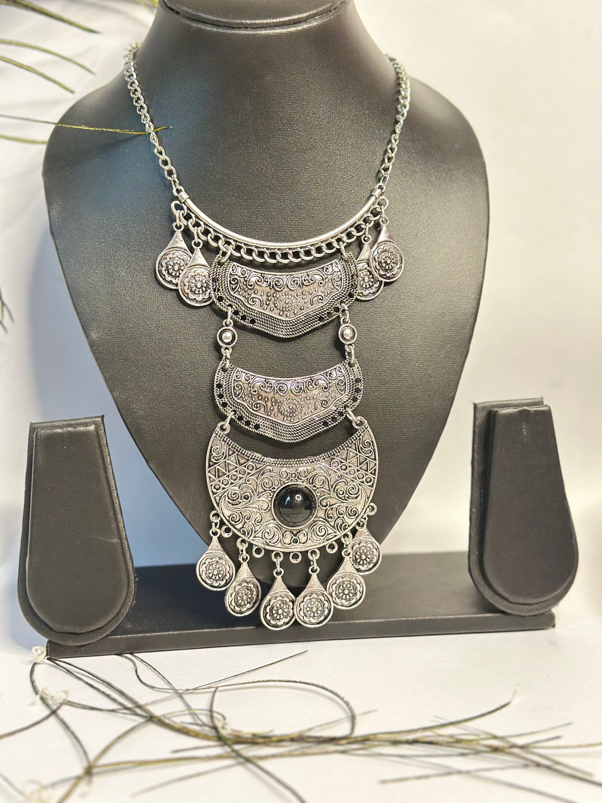Elevate your ethnic and fusion outfits with this beautifully handcrafted oxidised silver necklace. Featuring intricate floral engravings, layered crescent designs, and a striking black stone centerpiece, this statement piece adds a bold yet elegant touch to any look. Perfect for festive occasions, weddings, parties, or casual chic styling, this necklace blends tradition with modern charm.