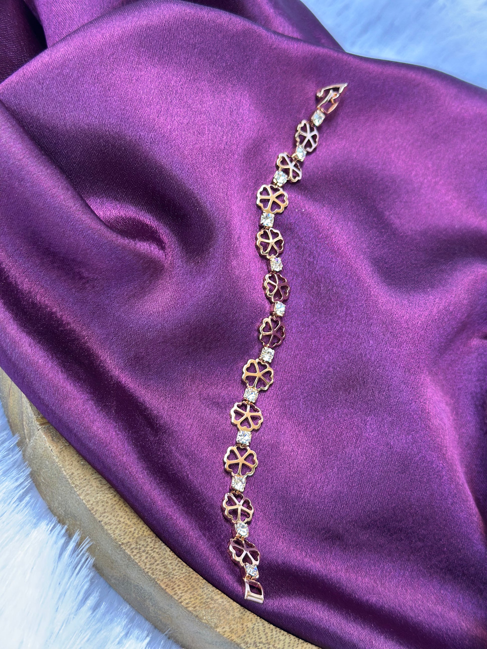 This elegant bracelet features delicate clover-shaped motifs in a rose gold finish, beautifully paired with sparkling white stones for a graceful touch. Its lightweight and stylish design makes it perfect for daily wear or special occasions. The adjustable fit ensures comfort while adding a refined sparkle to your wrist.