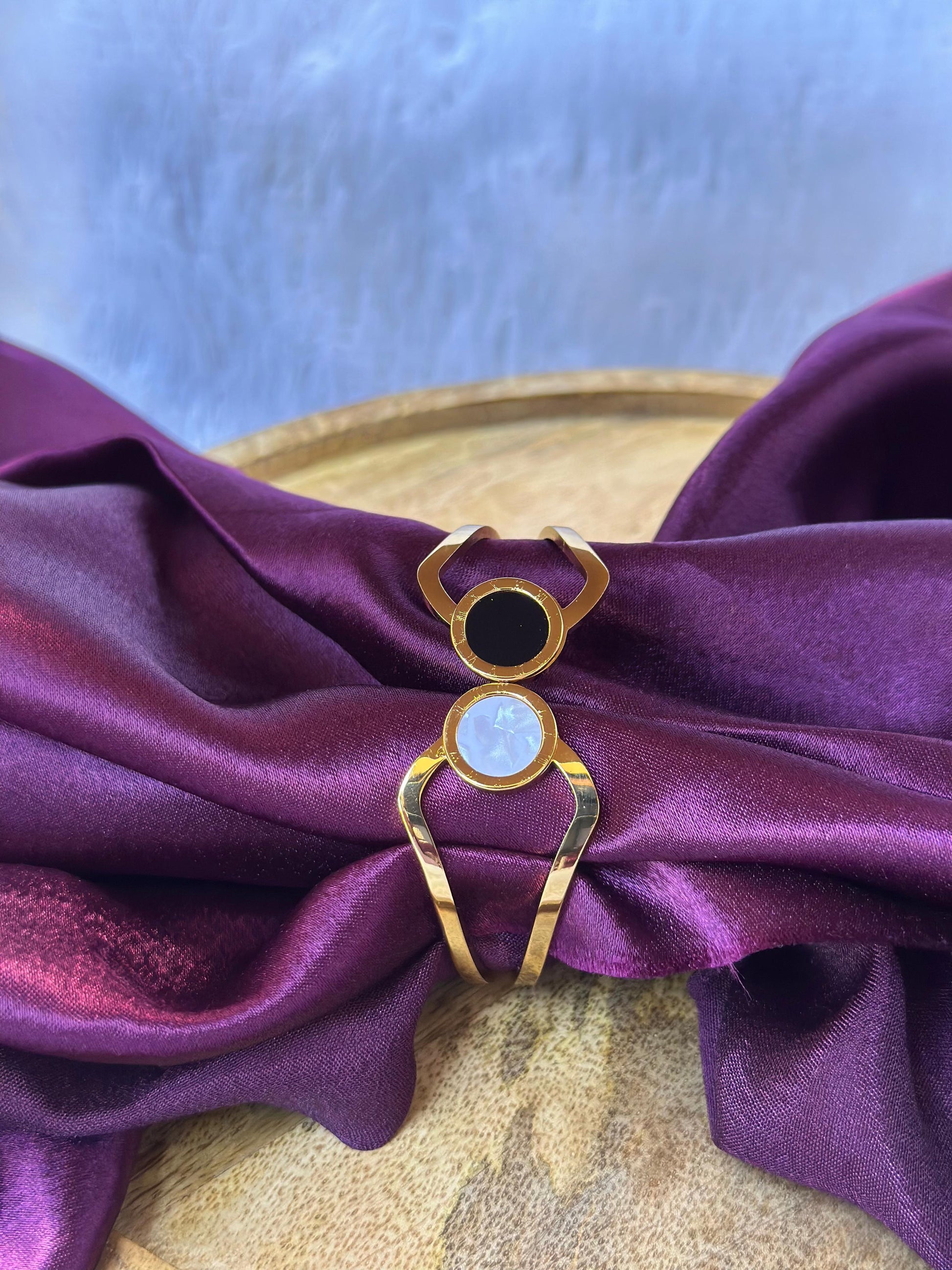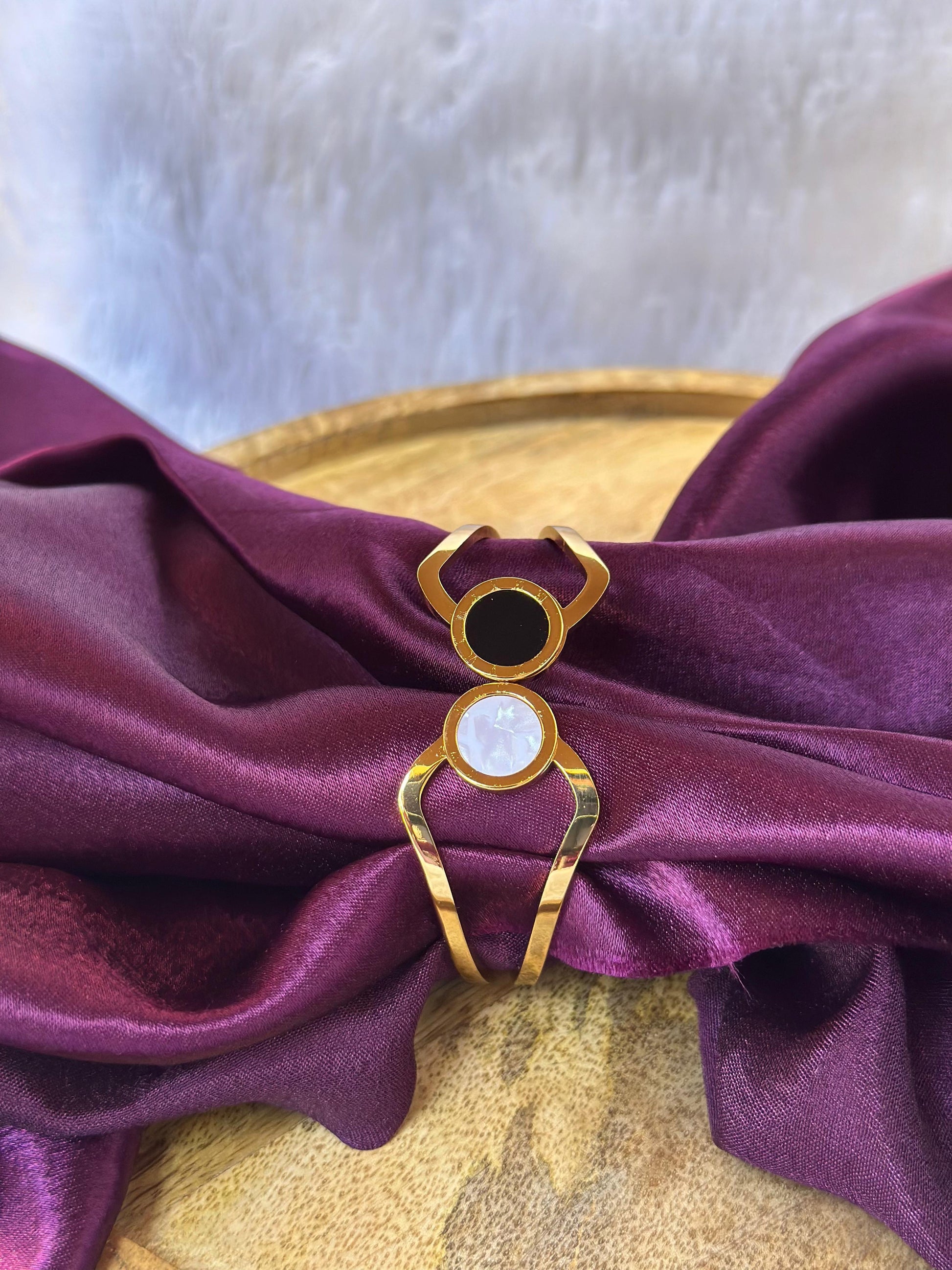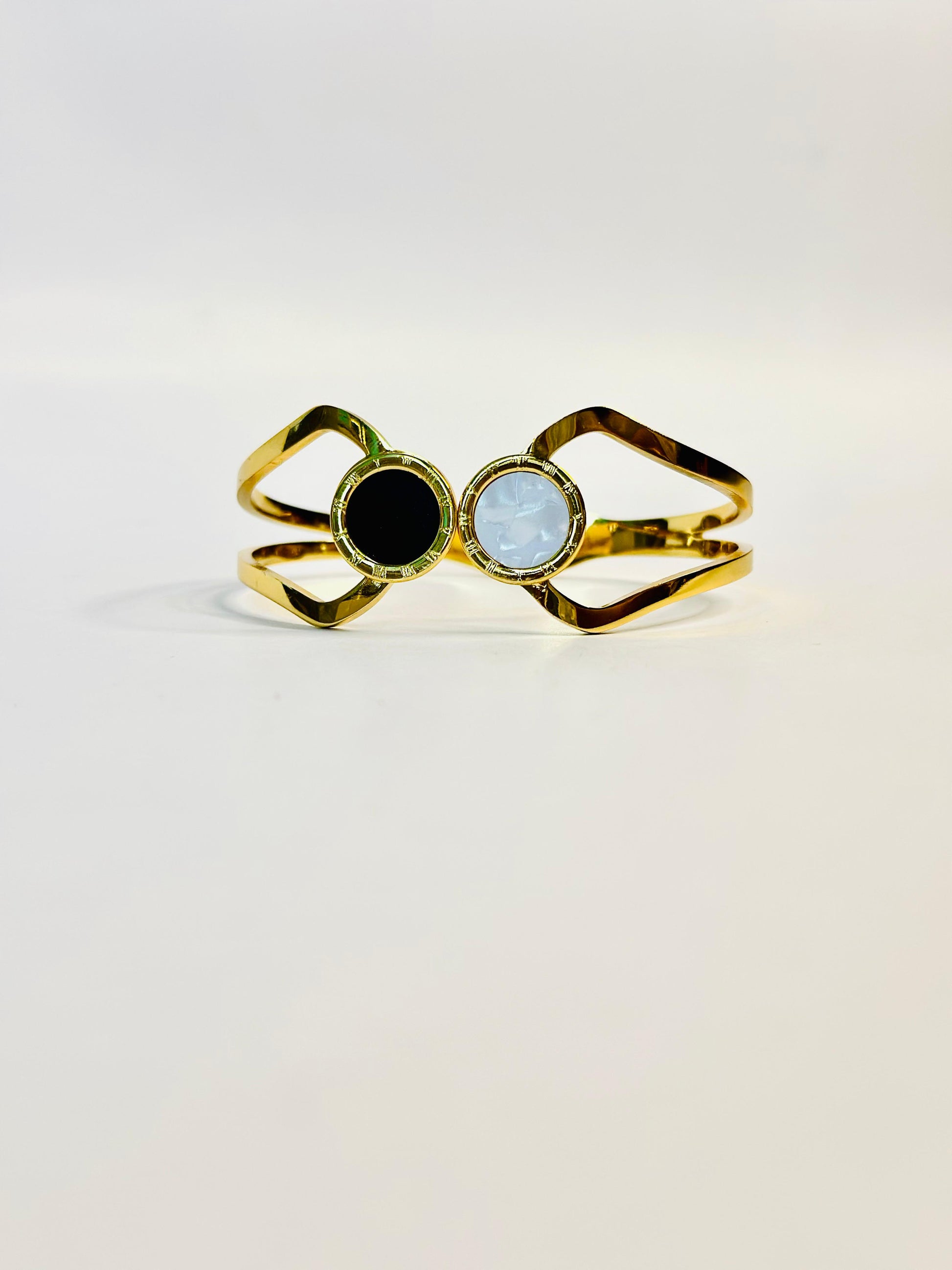 A sleek and modern open bangle bracelet featuring a dual-tone design with contrasting black and white circular stones, crafted to complement any outfit with elegance and sophistication.