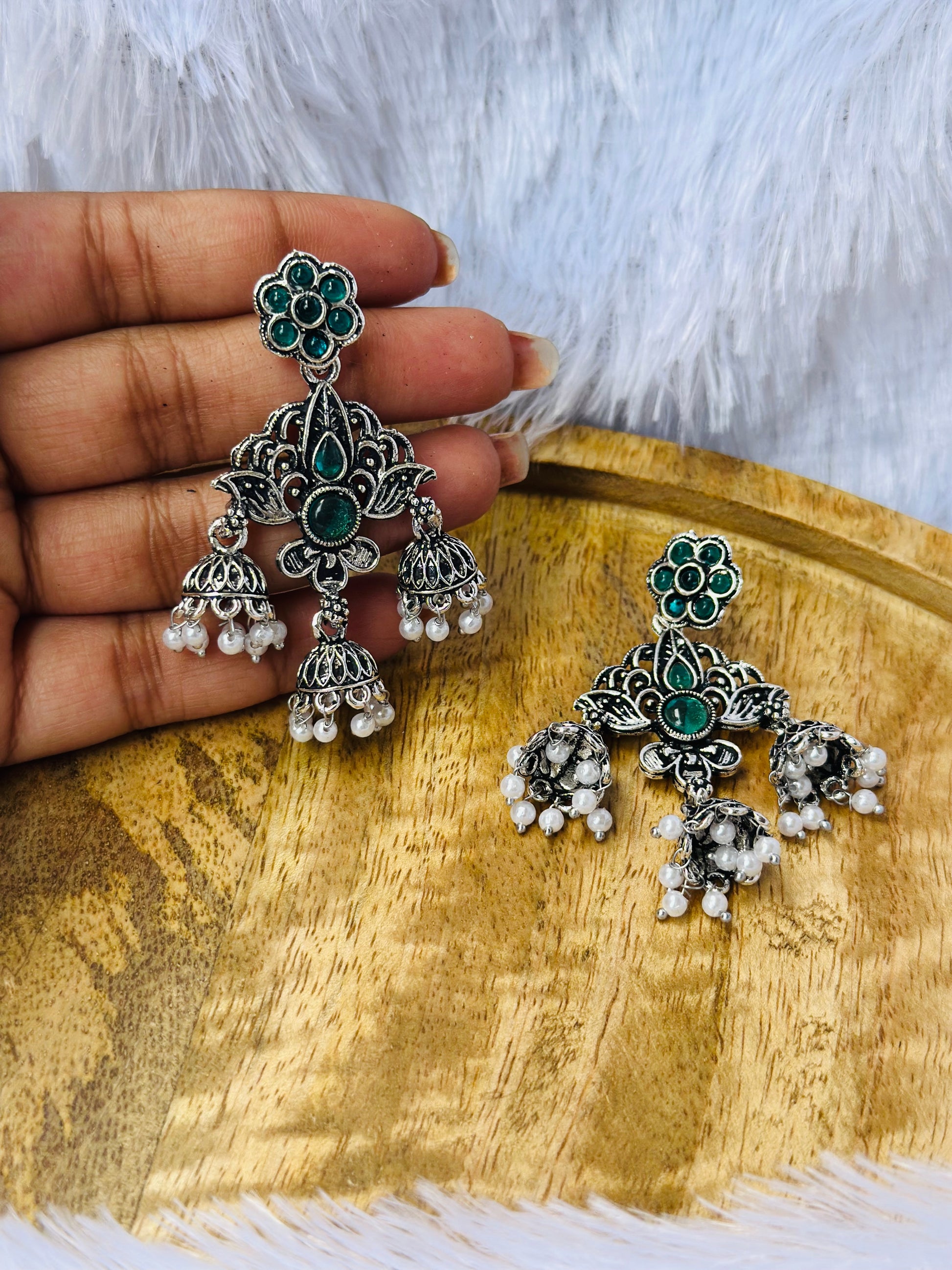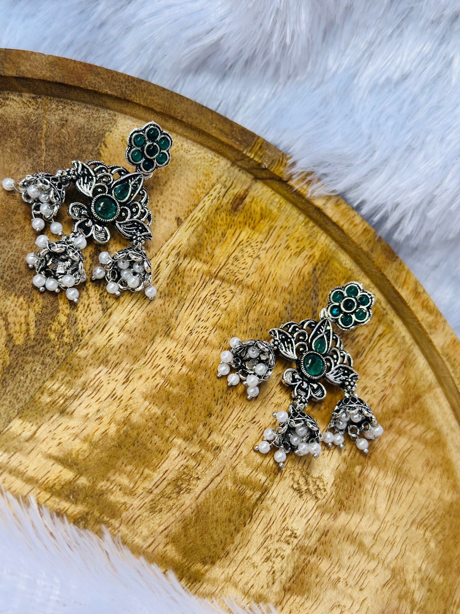 These beautifully crafted oxidized silver jhumka earrings feature intricate floral designs adorned with green stones and delicate pearl hangings. Perfect for ethnic wear, festive occasions, and traditional celebrations, these earrings add a timeless charm to your look .