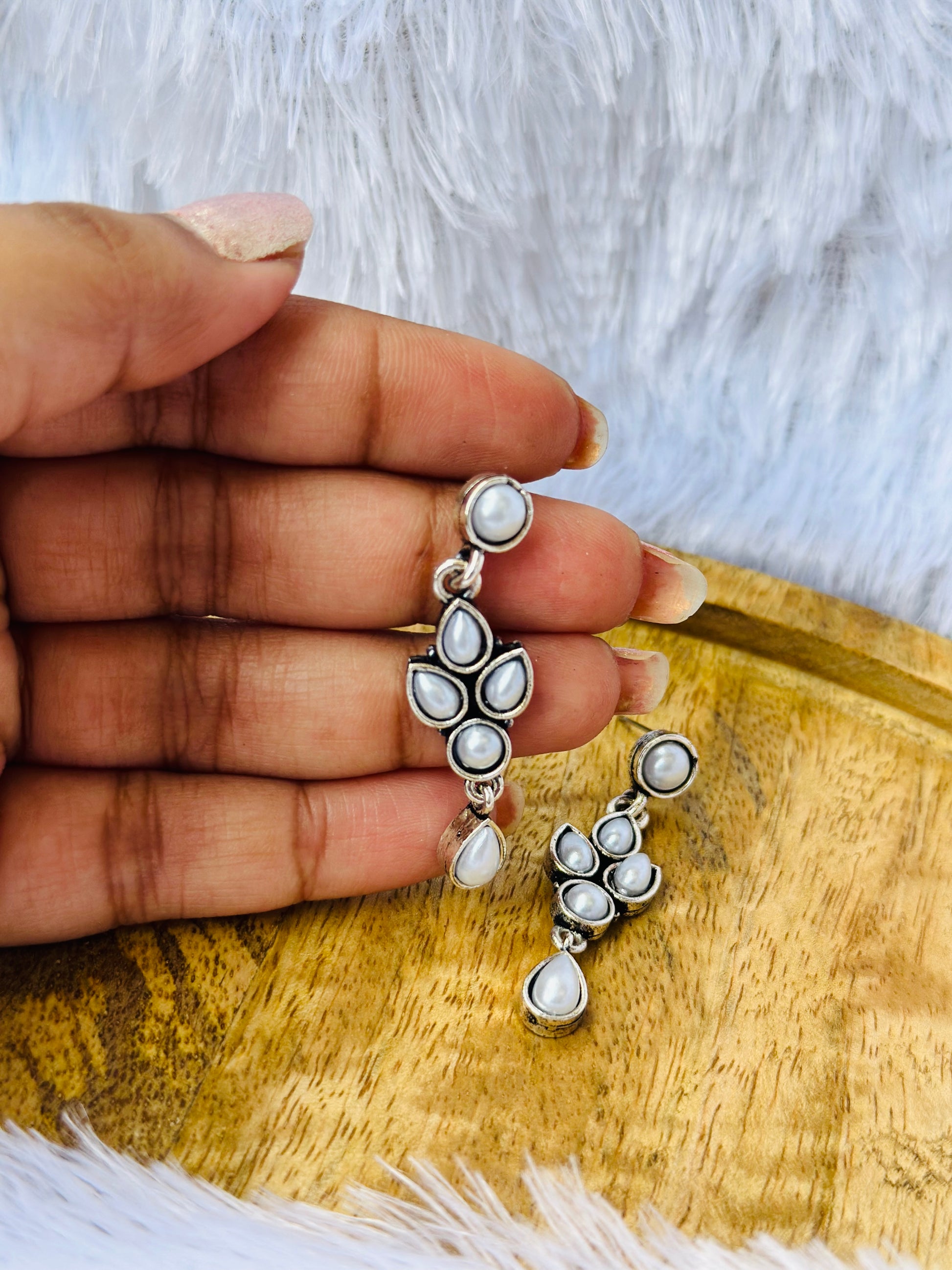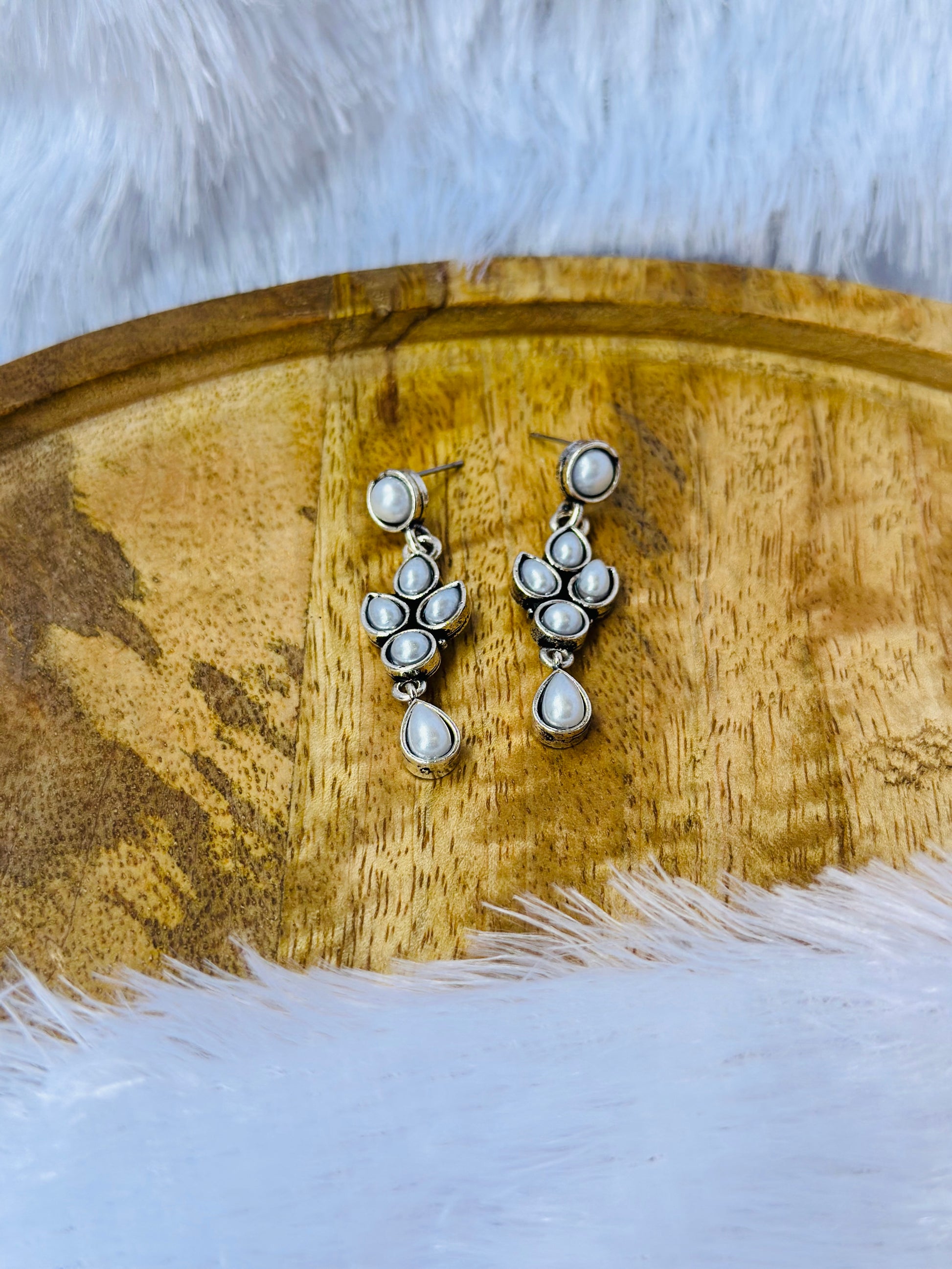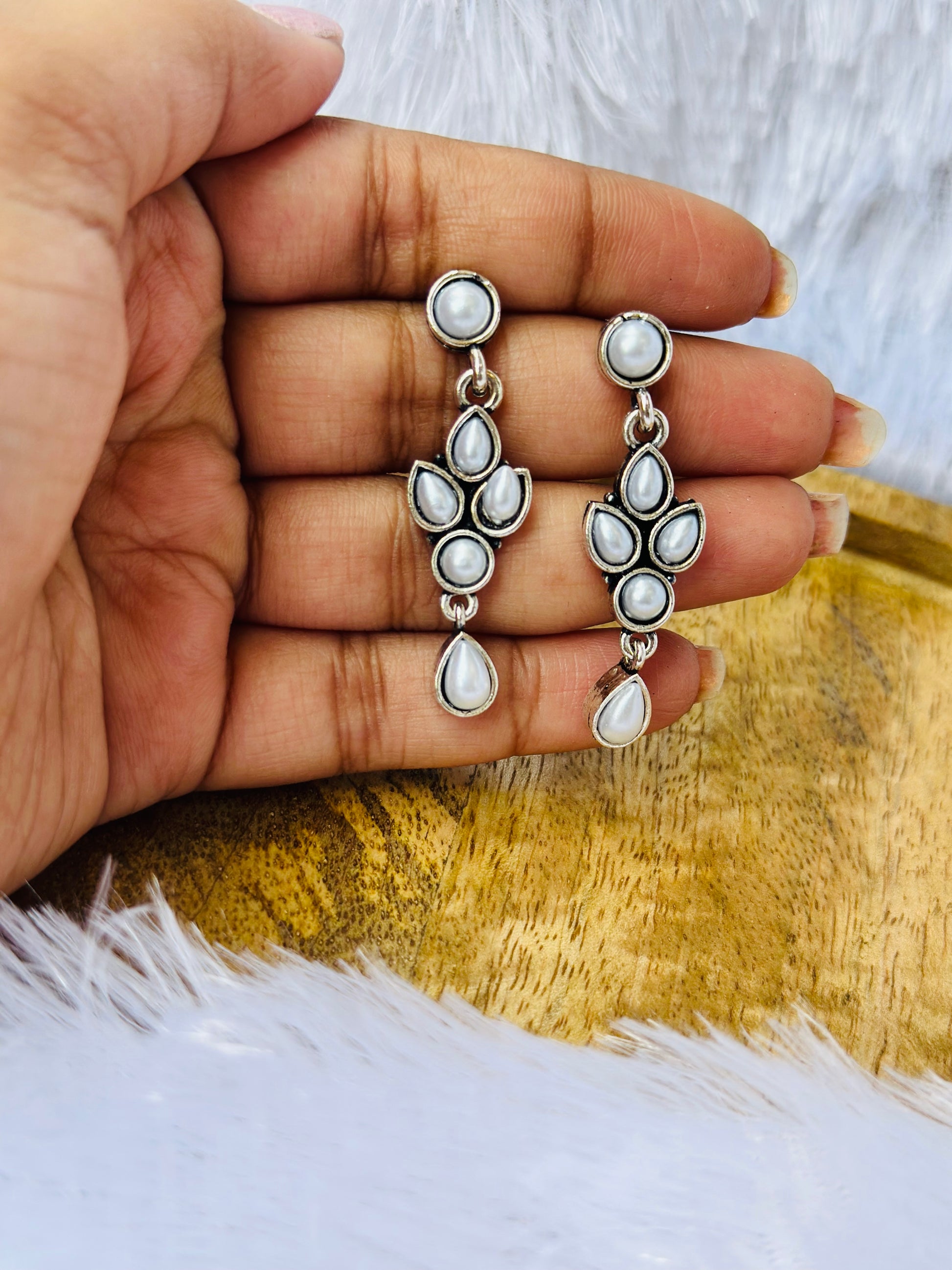 These stunning drop earrings feature a combination of round and teardrop-shaped white stones set in a silver-toned base. Their floral-inspired design adds a touch of sophistication, making them perfect for both traditional and modern outfits. Lightweight and comfortable, they’re ideal for festive occasions, parties, or daily wear.