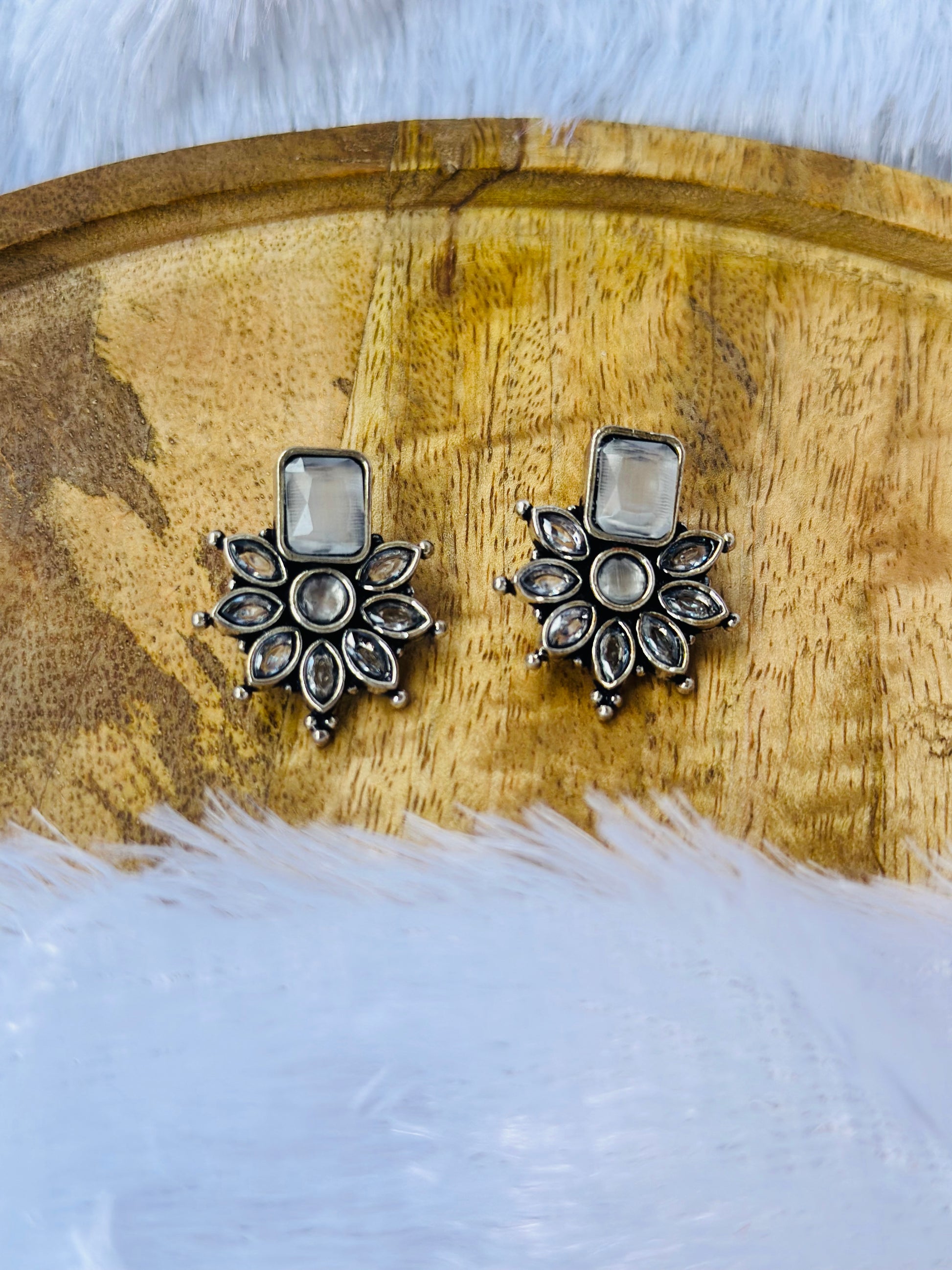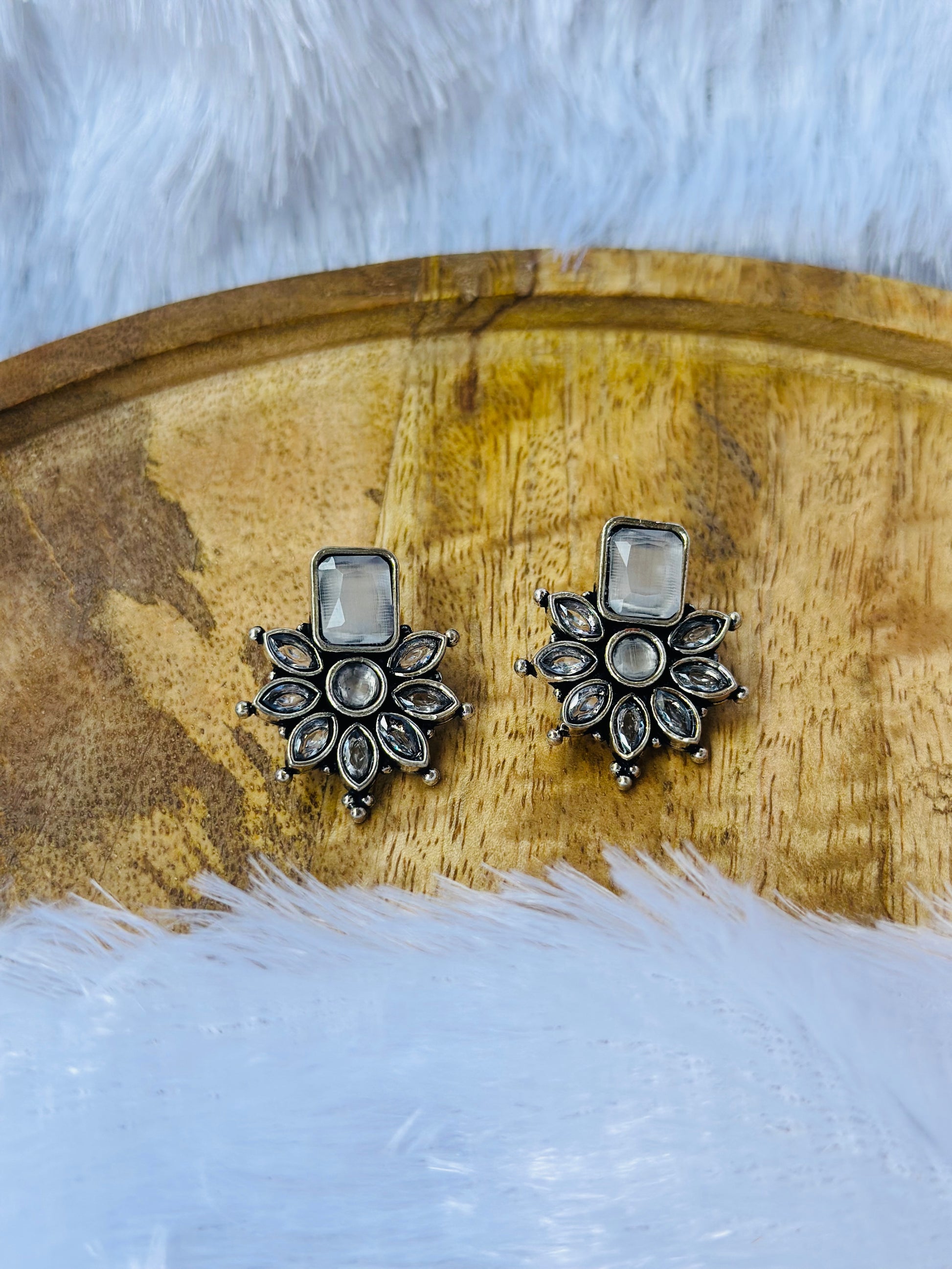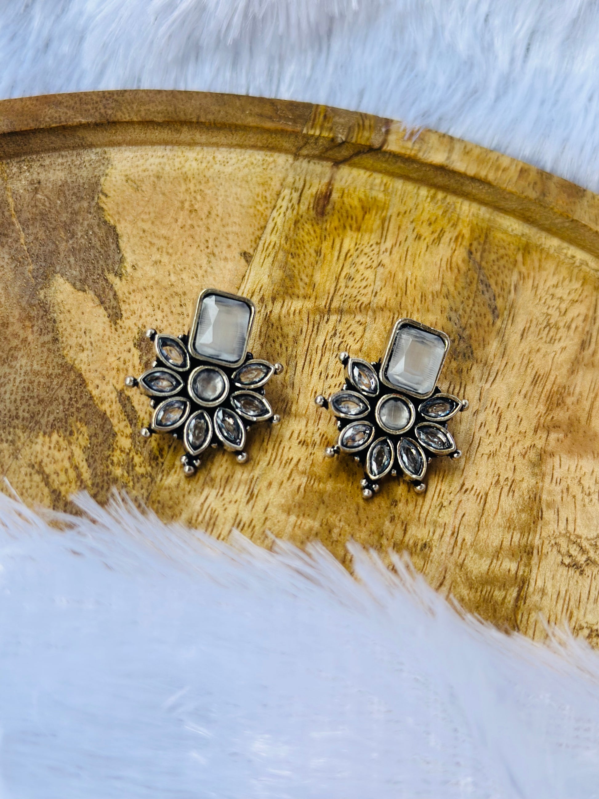 Elegant handcrafted earrings featuring a floral design with moonstone detailing. The unique blend of square-cut and petal-shaped stones set in oxidized silver adds a touch of timeless beauty. Perfect for both traditional and contemporary outfits.