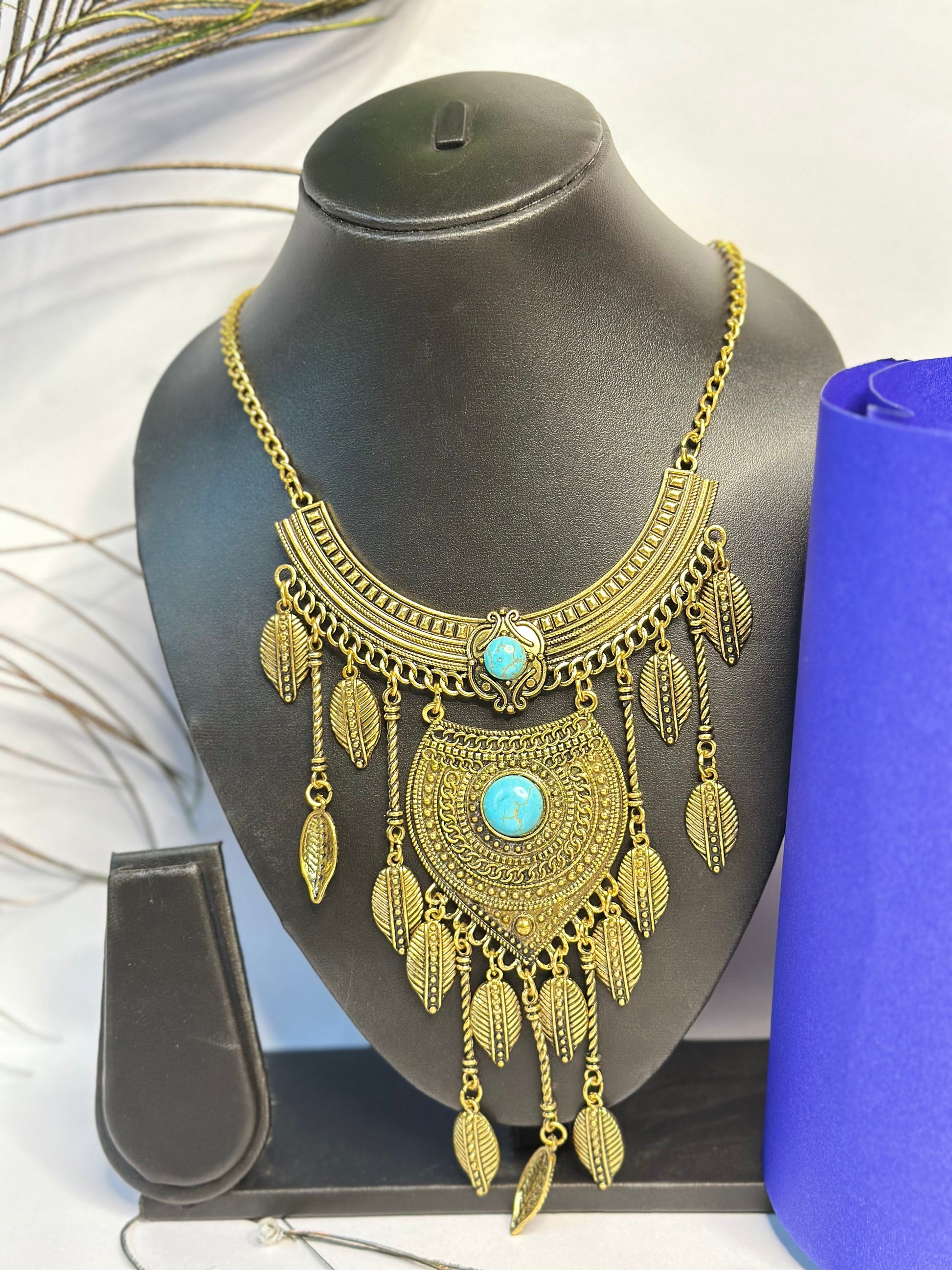 Elevate your ethnic and boho look with this antique gold-toned statement necklace. Featuring intricate engravings, turquoise blue stone embellishments, and dangling leaf charms, this lightweight yet bold piece is perfect for festive occasions, parties, or casual chic styling. Designed to add a touch of elegance and uniqueness, it complements both traditional and western outfits.