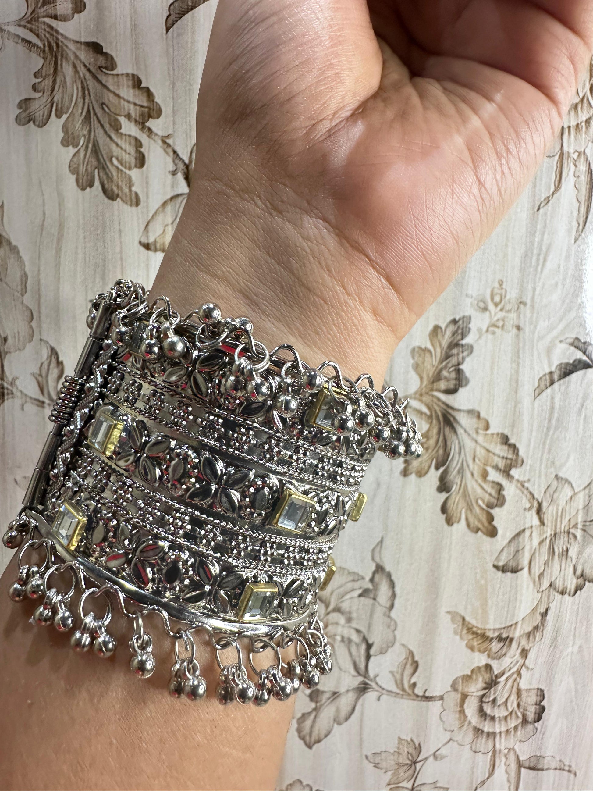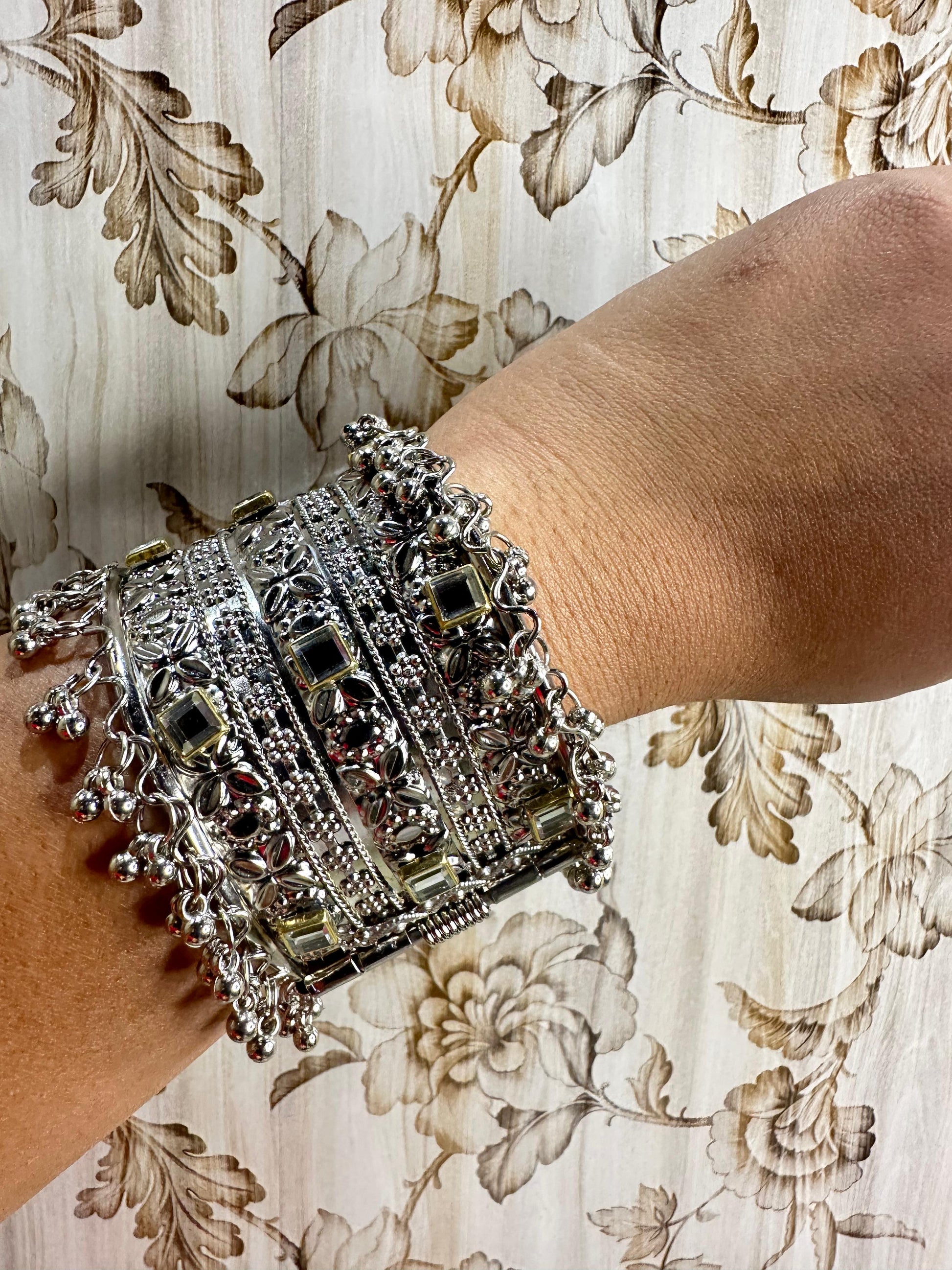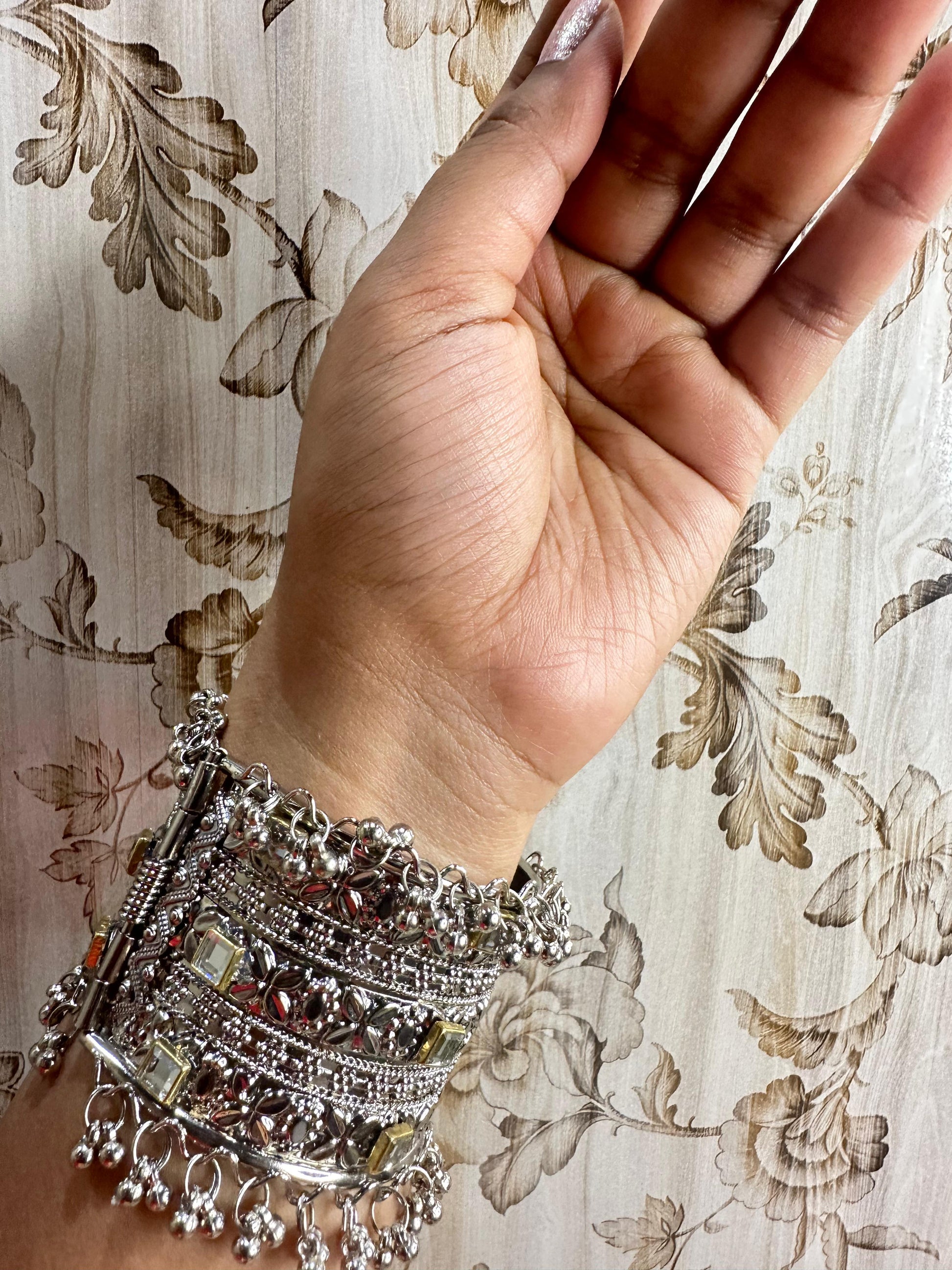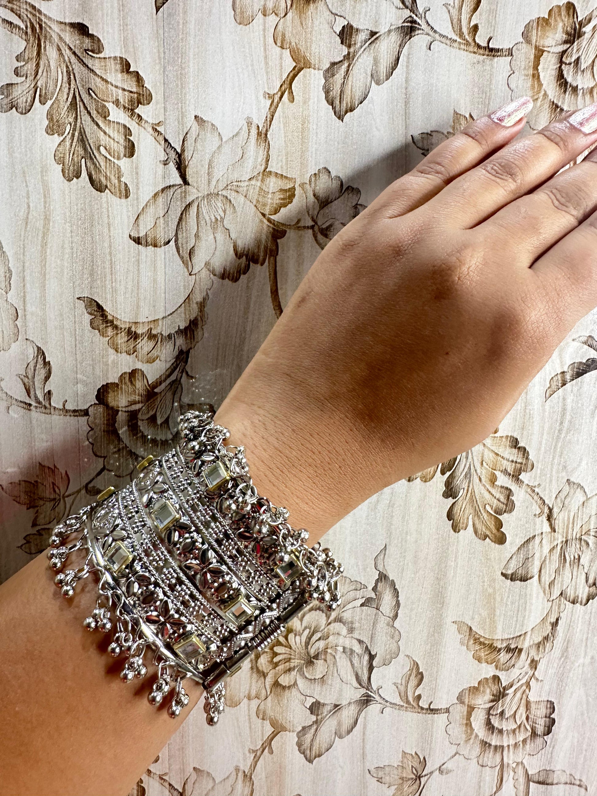 Enhance your style with this exquisitely crafted Royal Elegance Silver Charm Bracelet. Designed with intricate patterns, sparkling mirror embellishments, and delicate dangling beads, this bracelet blends traditional artistry with a modern touch. Perfect for festive occasions, weddings, and special events, it adds a statement charm to your wrist.