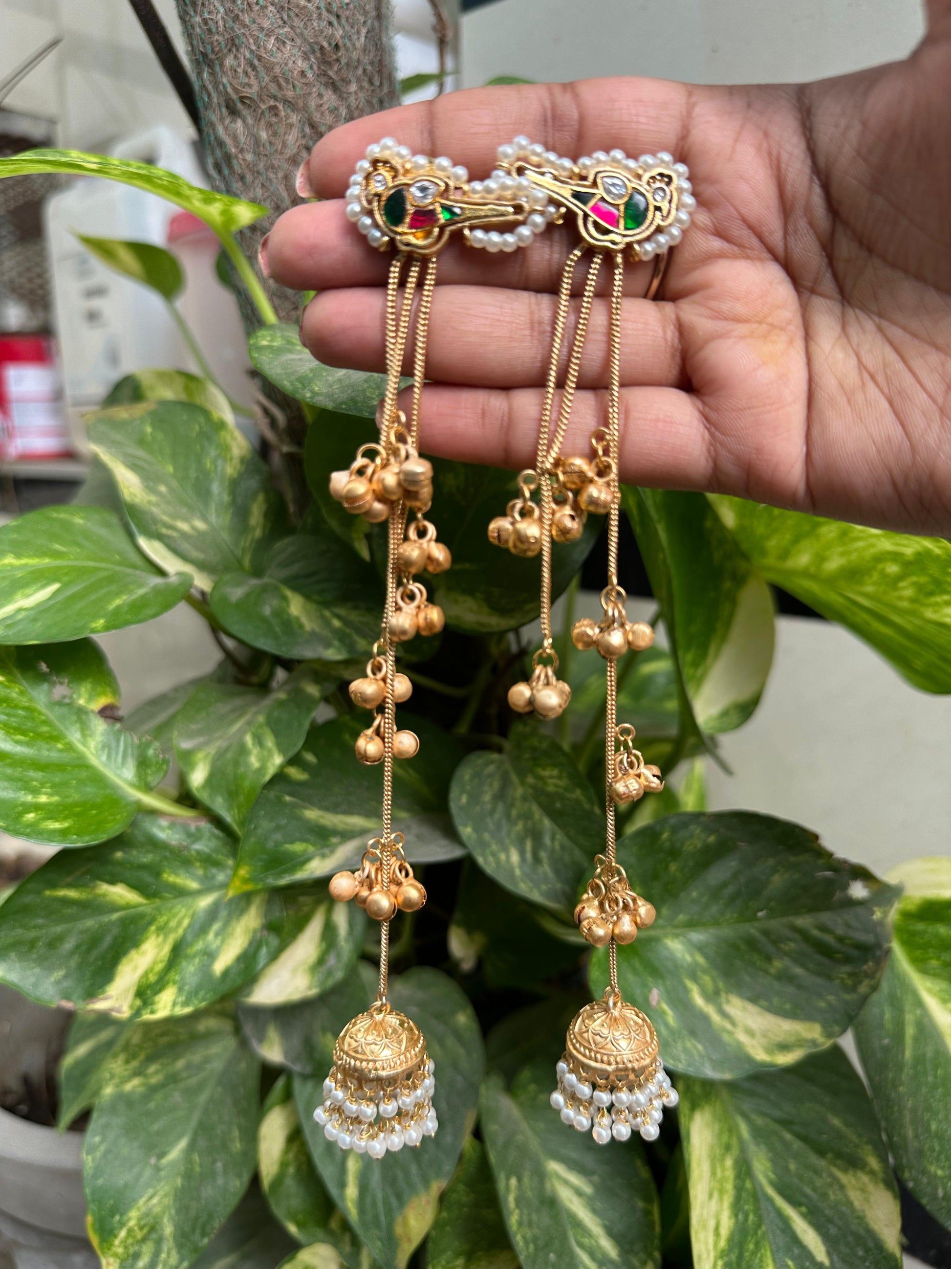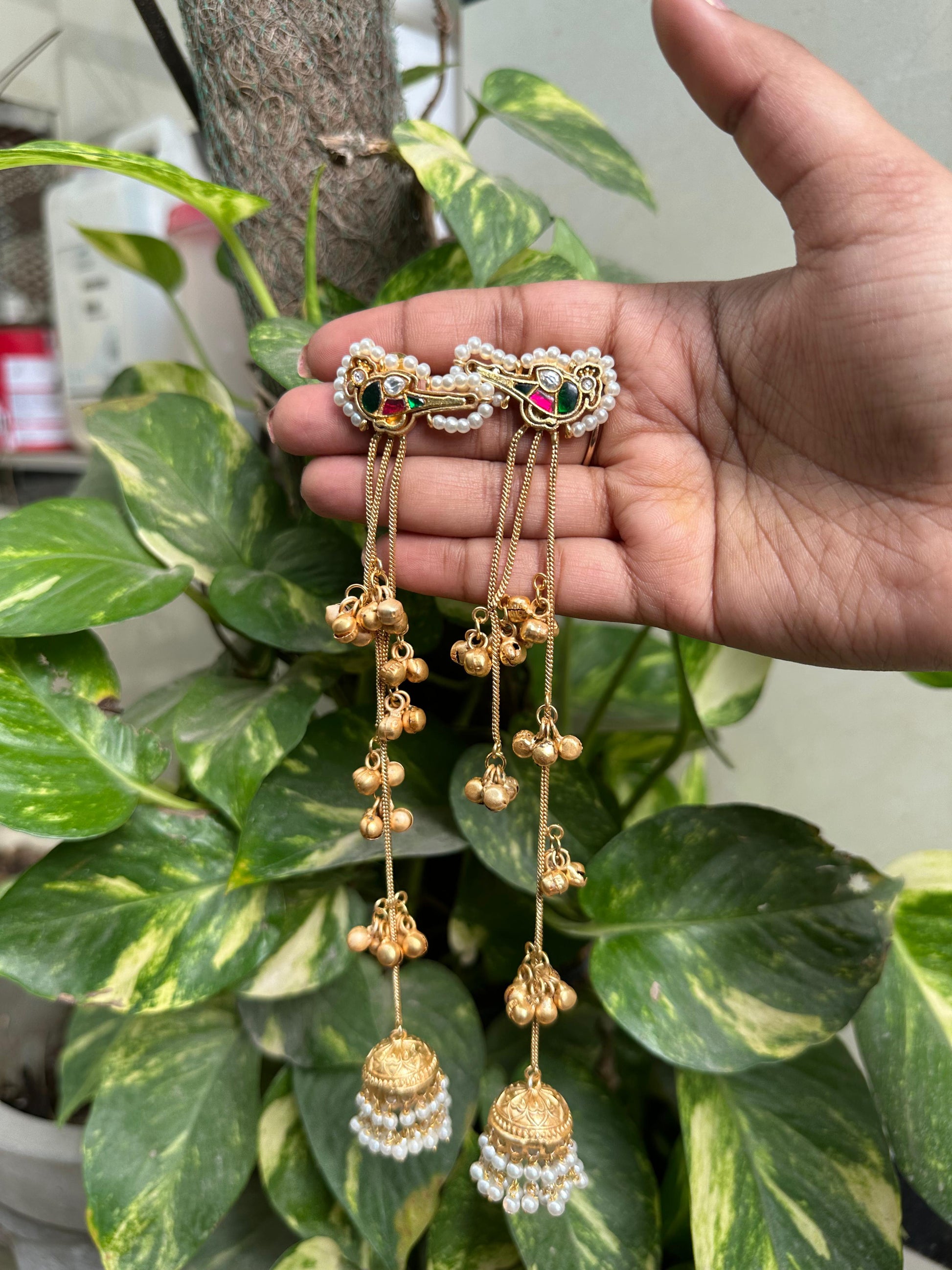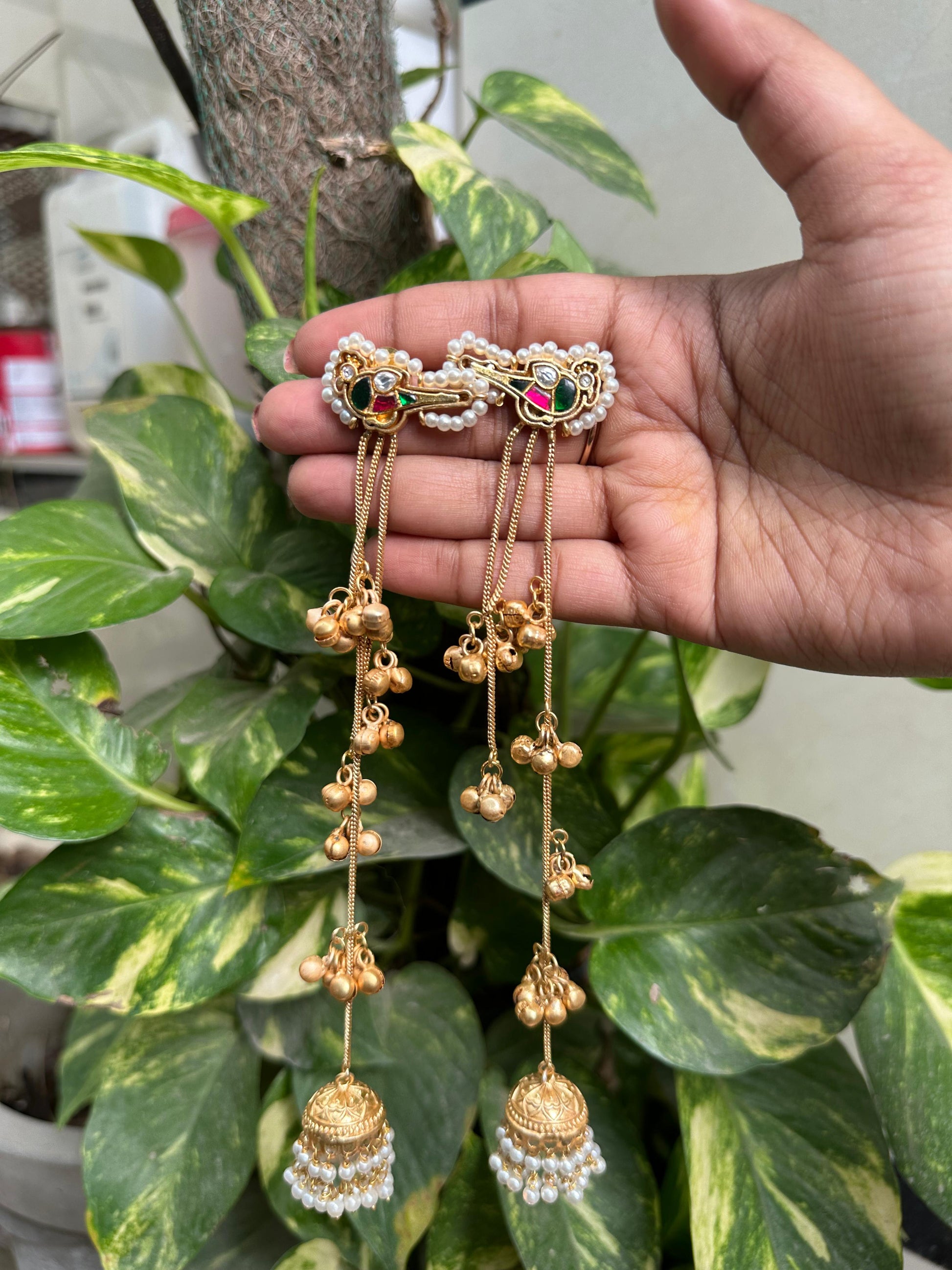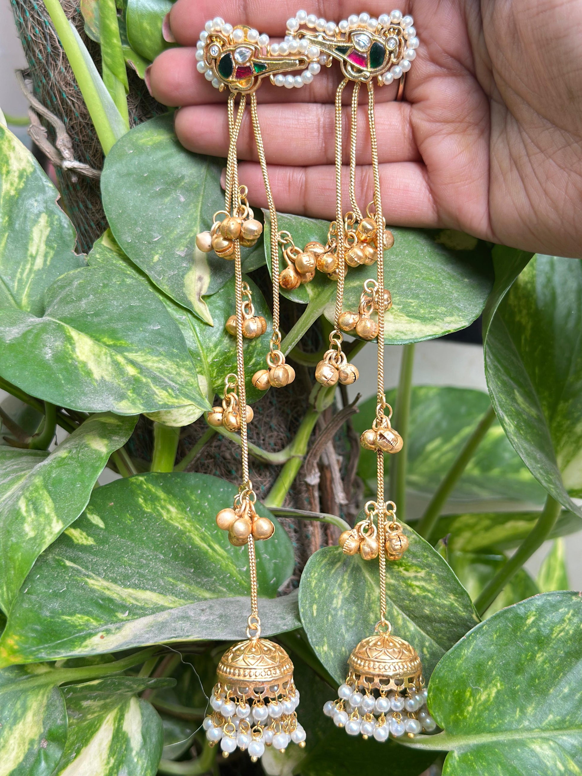 These elegant gold-plated jhumka earrings are beautifully adorned with intricate designs and pearl bead hangings, adding a touch of timeless charm. Perfect for weddings, festive celebrations, and traditional occasions, they complement both ethnic and contemporary outfits effortlessly.