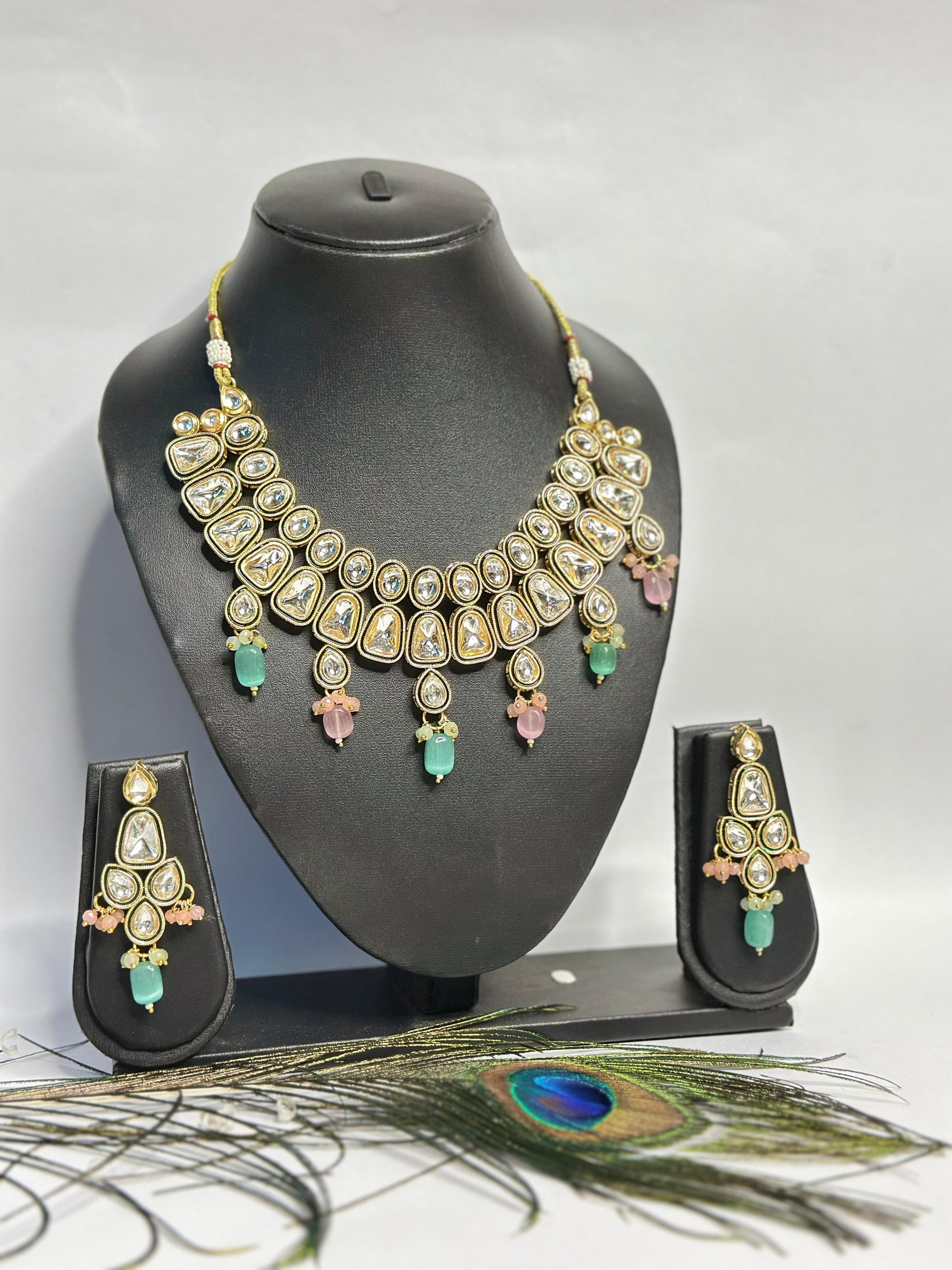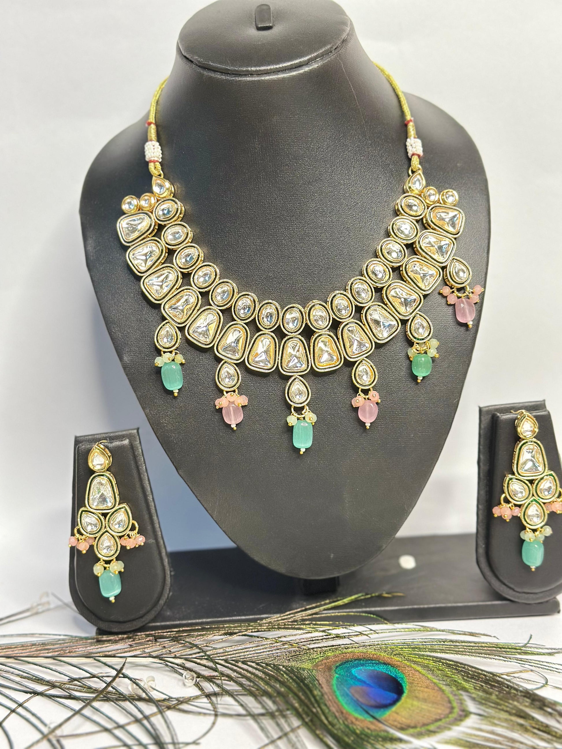 This elegant Kundan necklace set is beautifully handcrafted with premium quality stones and intricate detailing. The set includes a statement necklace paired with matching earrings, designed to complement festive occasions, weddings, and traditional celebrations. The pastel pink and green stones add a touch of charm and vibrance to the timeless gold finish.