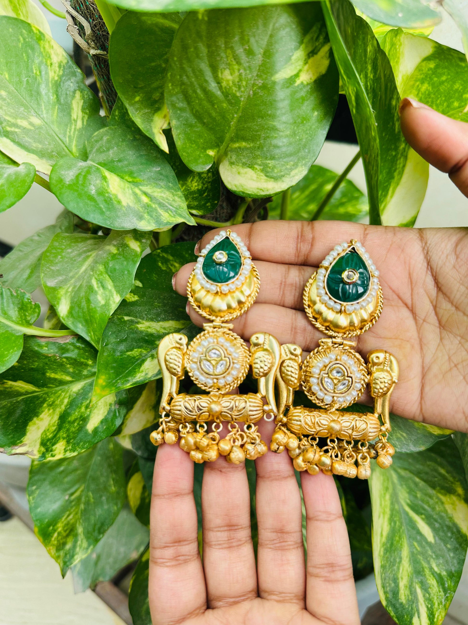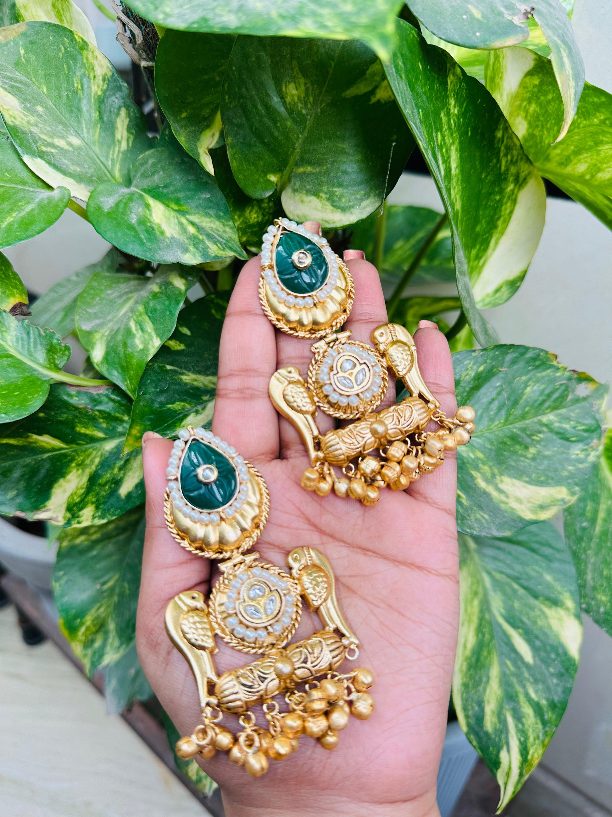 These exquisite handcrafted earrings feature a rich combination of traditional design and modern elegance. The gold-toned base with green teardrop stones, delicate pearl-like accents, and intricate peacock motifs makes them a perfect accessory for festive and special occasions.