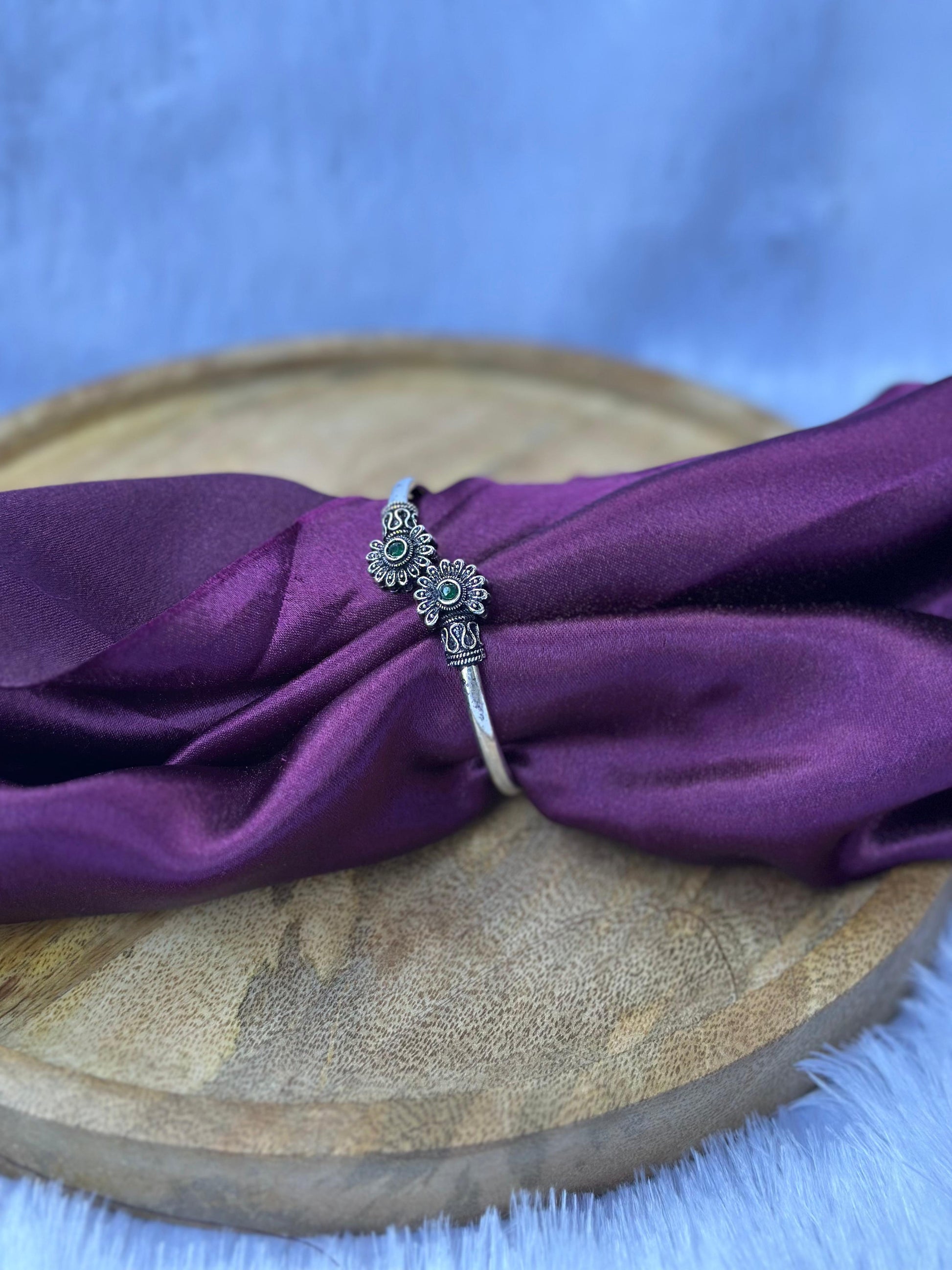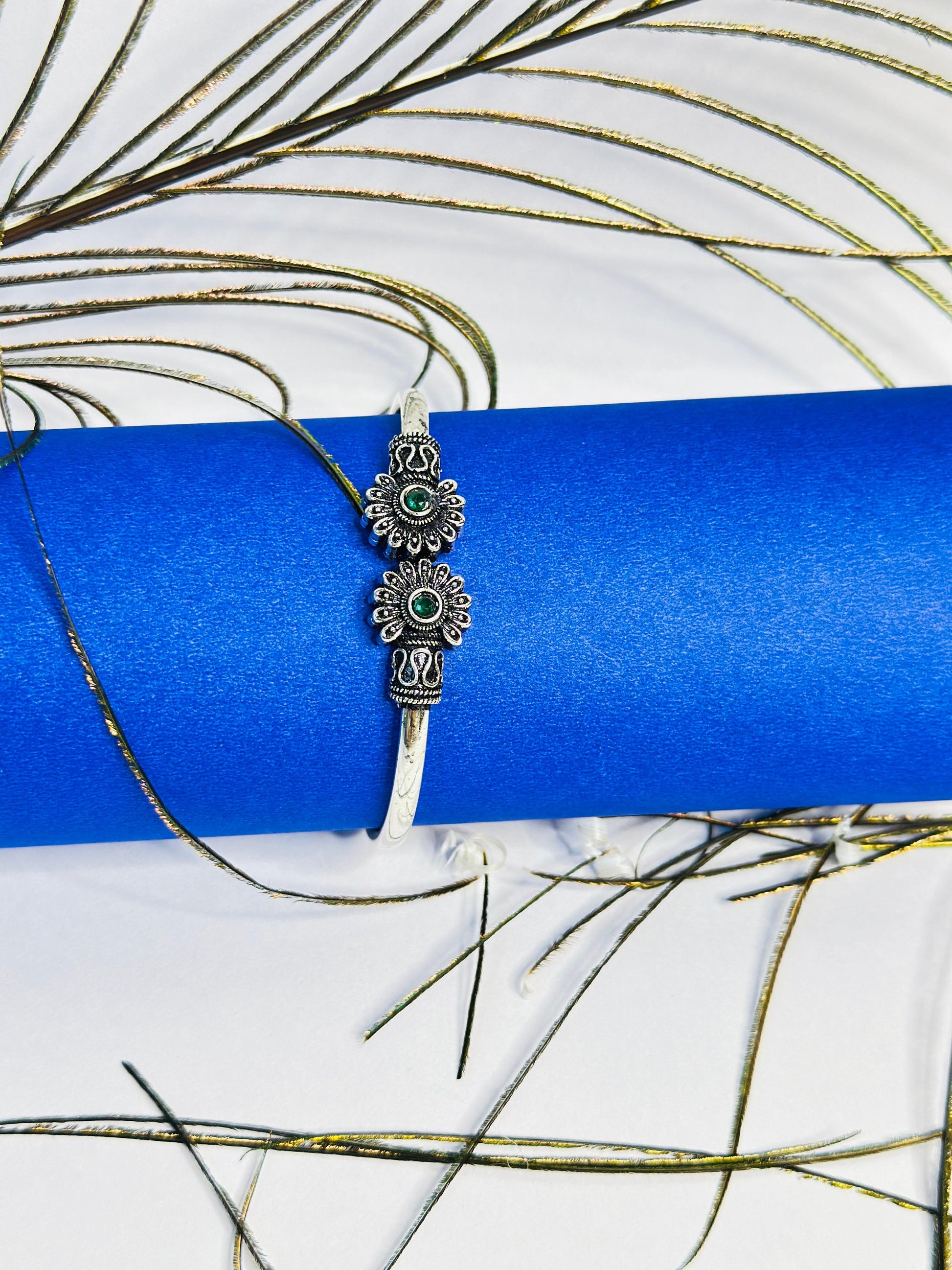 A beautifully handcrafted oxidised bracelet featuring dual floral motifs and green stone accents, designed to bring a touch of ethnic elegance to your everyday style.